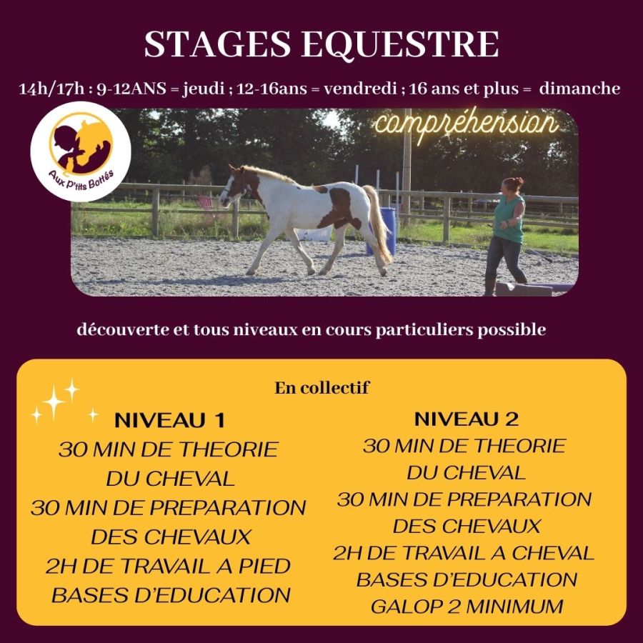 les découvertes en binome parent/enfant comme l'éveil-poney ( a partir de 1 an) ,le baby-poney (de 3 ans a 5 ans) ainsi que tout les niveaux de cycles d'apprentissages et d'ages jusqu'au perfectionnement (galop 7 et compétitions) sur des stages collectifs ou cours particuliers.